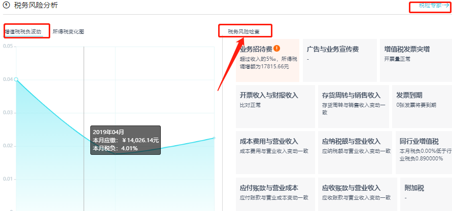 3、稅務(wù)風(fēng)險(xiǎn)分析稅務(wù)風(fēng)險(xiǎn)分析里,有各項(xiàng)常用的指標(biāo),比如各項(xiàng)費(fèi)用是否超標(biāo),發(fā)票是否異常增加、存貨周轉(zhuǎn)是否正常,可以提示會(huì)計(jì)賬務(wù)里的風(fēng)險(xiǎn)點(diǎn)。